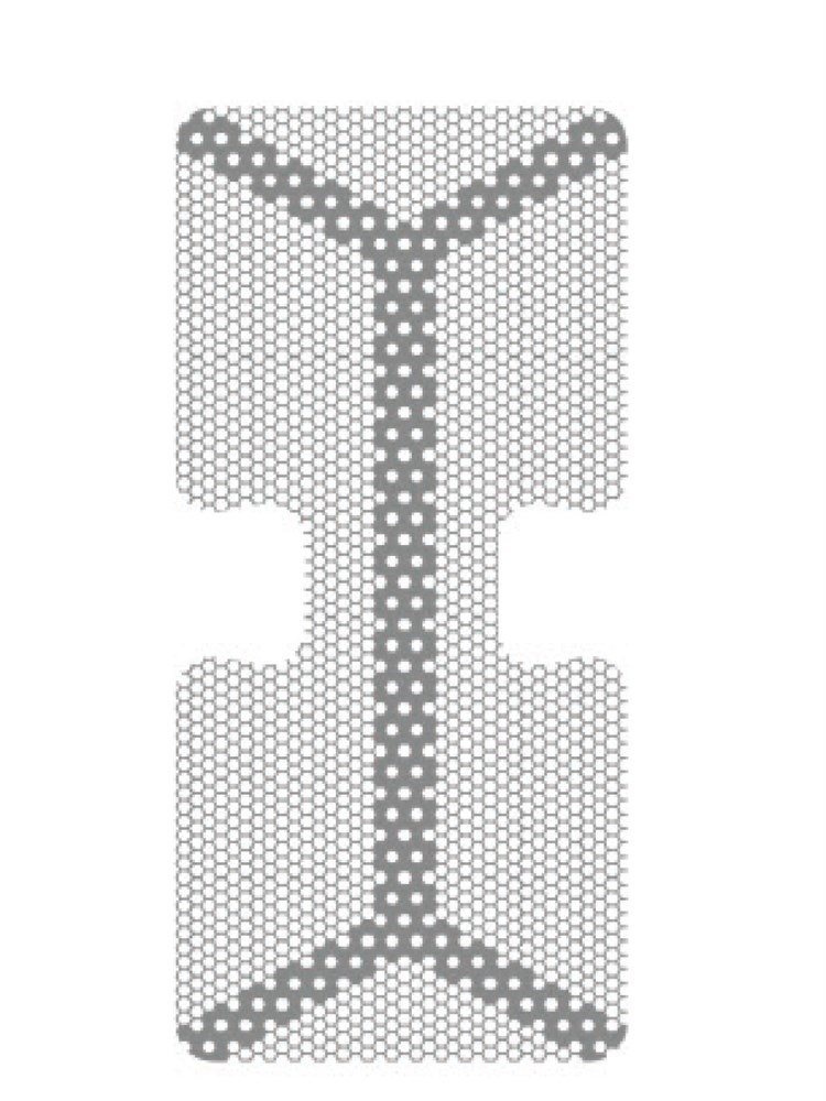 - оптимальный Ø и шестигранная форма ячеек обеспечивают быструю регенерацию аугментата за счет интенсивной микроциркуляции крови;