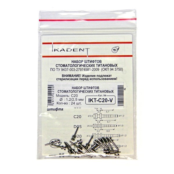 Титановые пассивные анкерные штифты C20, d1=2.5 мм, d2=1.2 мм, набор 24 шт, 3 инструмента, ключ