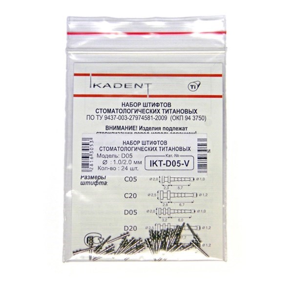 Титановые пассивные анкерные штифты D05, d1=2.0 мм, d2=0.9 мм, набор 24 шт, 1 инструмент
