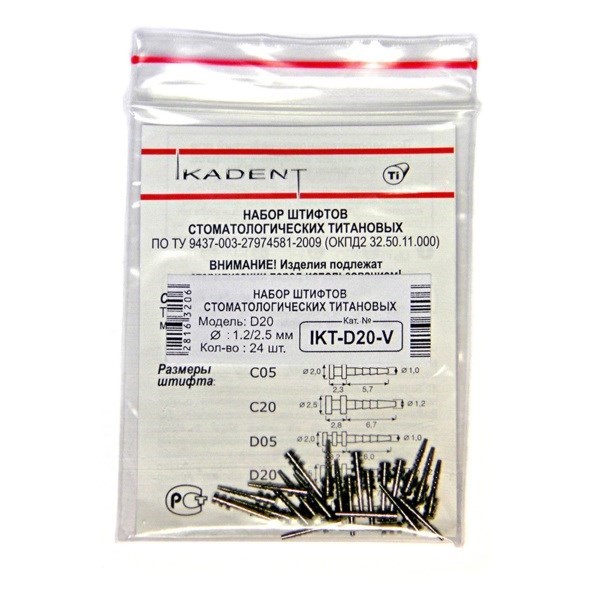 Титановые пассивные анкерные штифты D20, d1=2.5 мм, d2=1.2 мм, набор 24 шт, 3 инструмента, ключ