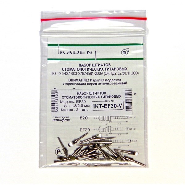 Титановые пассивные анкерные штифты под металлокерамику EF30, d1=2.5 мм, d2=1.3 мм, набор 24 шт