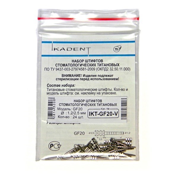 Титановые пассивные анкерные штифты с плоской коронковой частью GF20, d1=2.5 мм, d2=1.2 мм, набор 24 шт, 3 инструмента, ключ
