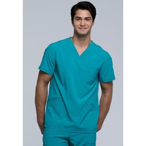 Мужской медицинский топ Cherokee CK900A выполнен в современном крое, имеет V-образный вырез в стиле модерн, нагрудный карман с люверсами, прорезные передние карманы с тройной строчкой, переднюю и заднюю кокетки и эластичные вставки на спине в рубчик для дополнительного комфорта.