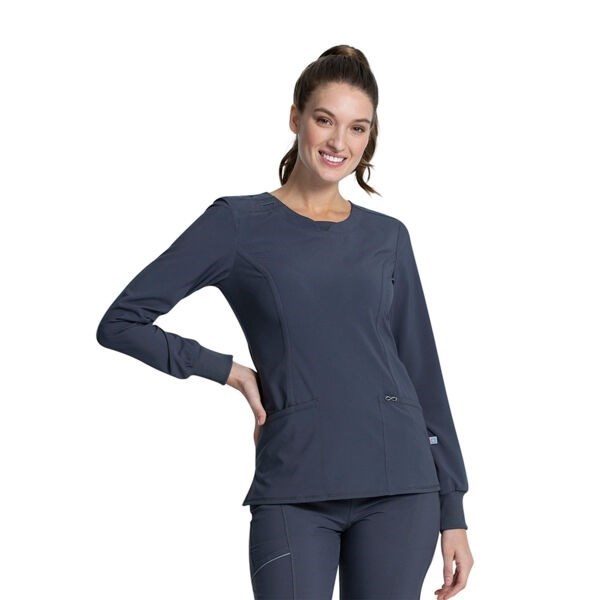 Современный топ с длинными рукавами Cherokee CK781A имеет V-образный вырез с трикотажной вставкой и петлю для бейджа на правом плече. Центральная панель спинки и манжеты рукавов выполнены из трикотажной вставки. Изделие дополнено тремя карманами: два передних накладных и один внутренний для мобильного телефона справа. Боковые вентиляционные отверстия завершают образ.