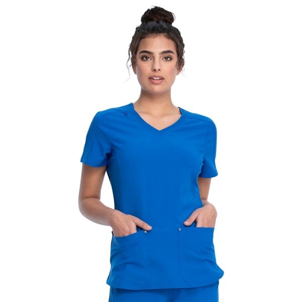 Женский медицинский топ Cherokee CKK817 выполнен в современном крое с v-образным вырезом у которого имеется стильная конструкция с вязаной вставкой. Изделие дополнено боковыми разрезами, петлей для бейджа на правом плече и тремя карманами: два передних накладных и один задний врезной. Трикотажные вставки спереди и сзади добавляют комфорта и моделируют фигуру.