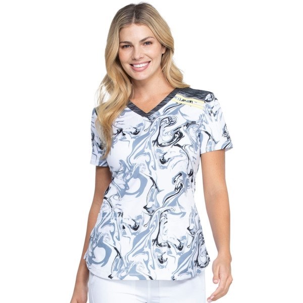 Женский медицинский топ DK602 бренда Dickies выполнен в современном крое, имеет v-образный принтованный вырез, боковые разрезы, а также кокетки спереди и сзади. Для хранения вещей предусмотрено три кармана: два передних накладных кармана и карман на молнии на рукаве. В правом кармане с правой стороны находится выход для тональной прокладки кабеля.