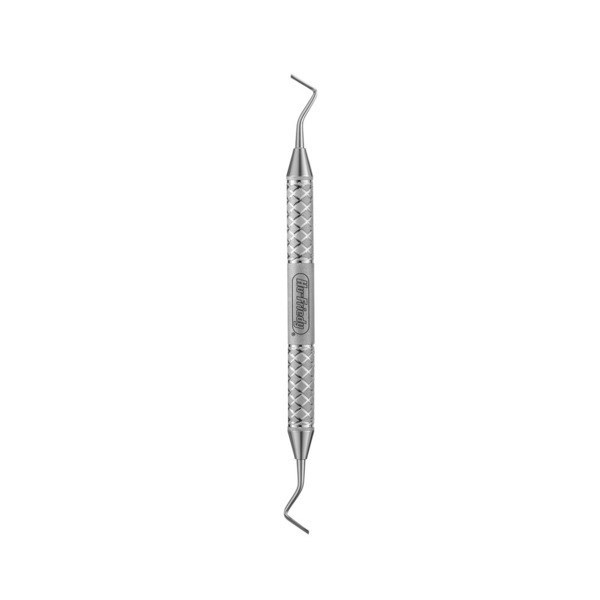 Изогнутый стержень легко проникает в самые труднодоступные участки полости рта. Прямоугольная рабочая часть быстро и эффективно снимает слои поврежденной ткани, не затрагивая здоровые участки.