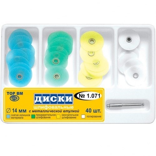 Описание: ТОР-1.071 Диски полировочные d14мм набор (4*10+дискодержатель)Диски шлифовальные выпускаются на лавсановой основе. Удобны для обработки пломб из композитных материалов на фронтальных зубах, а также на проксимальных, вестибулярных, язычных и небных поверхностях жевательной группы зубов.