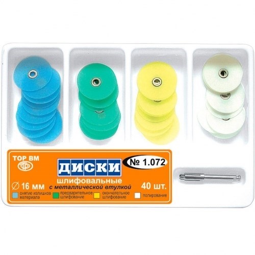 Описание: ТОР-1.072 Диски полировочные d16мм набор (4*10+дискодержатель)Диски шлифовальные выпускаются на лавсановой основе. Удобны для обработки пломб из композитных материалов на фронтальных зубах, а также на проксимальных, вестибулярных, язычных и небных поверхностях жевательной группы зубов.