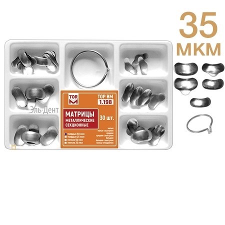 Описание: ТОР-1.198 Матрицы секционные 4-х форм 30 шт.+кольцо 35 мкмМатрицы ТОР-1.198 металлические секционные 35 мкрн. (30 шт).