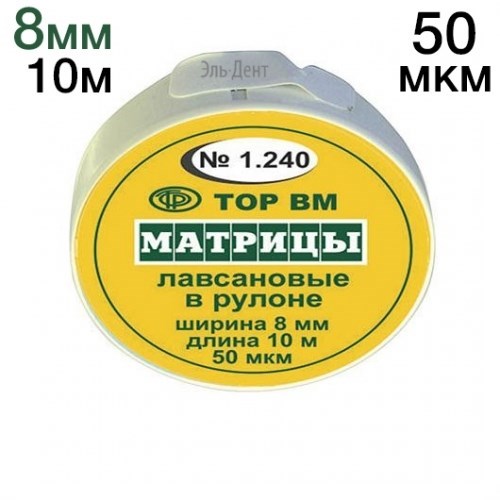 Описание: ТОР-1.240 Матрицы пластиковые в рулетке 8мм*10мМатрицы лавсановые сепарационные в рулоне (круглая упаковка).