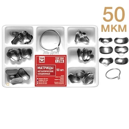 Описание: ТОР-1.298 Матрицы секционные металлические 5-и форм 50 шт.+кольцо 50мкмМатрицы ТОР-1.298 металлические секционные 50 мкрн. (50 шт).