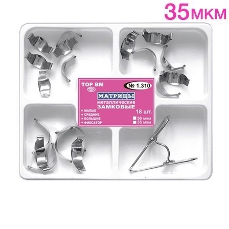 Описание: ТОР-1.310 Набор замковых матриц с фиксатором 18шт. 35мкмМатрицы металлические замковые ТОР-1.310 (35 мкрн).
