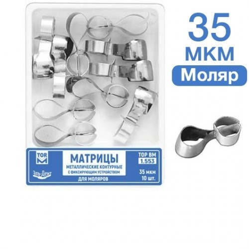 Описание: ТОР-1.553 Матрицы металлические контурные с фиксирующим устройством для моляров (форма 3) 10 шт. 35мкрМатрицы ТОР-1.553 металлические контурные с фиксирующим устройством для моляров
