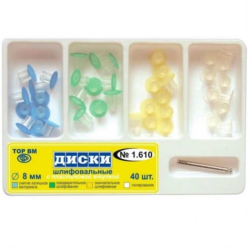 Описание: ТОР-1.610 Набор дисков шлифовальных с пластиковой втулкой диаметр 8 мм,4-х типов, 40шт.Диски шлифовальные выпускаются на лавсановой основе. Удобны для обработки пломб из композитных материалов на фронтальных зубах, а также на проксимальных, вестибулярных, язычных и небных поверхностях жевательной группы зубов.