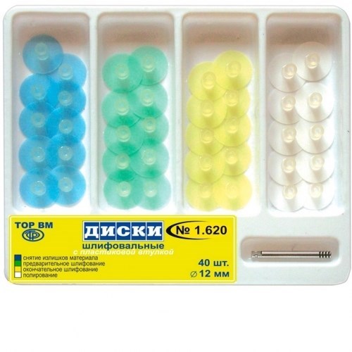Описание: ТОР-1.620 Набор дисков шлифовальных с пластиковой втулкой 4-х типов, d12мм, 40шт.Диски шлифовальные выпускаются на лавсановой основе. Удобны для обработки пломб из композитных материалов на фронтальных зубах, а также на проксимальных, вестибулярных, язычных и небных поверхностях жевательной группы зубов.