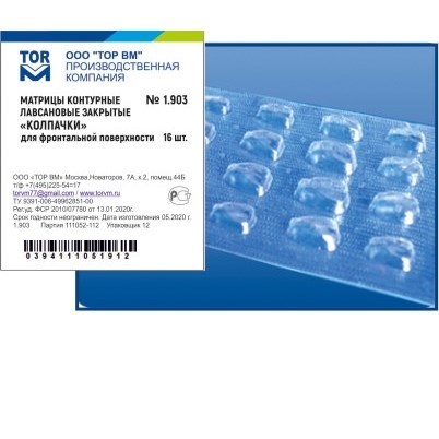 Описание: ТОР-1.903 Матрицы-колпачки для фронтальной поверхности резцовМатрицы № 1.903 контурные лавсановые закрытые "Колпачки" для фронтальной поверхности резцов 16 шт.