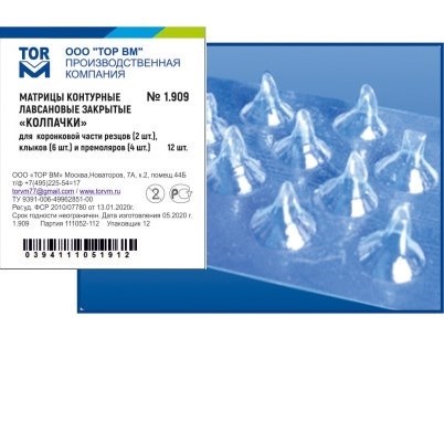 Описание: ТОР-1.909 Матрицы-колпачки для резцов (2шт.), клыков (6шт.), премол.(4шт.)Матрицы № 1.909 контурные лавсановые закрытые "Колпачки" для коронковой части резцов, клыков и премоляров 12 шт.
