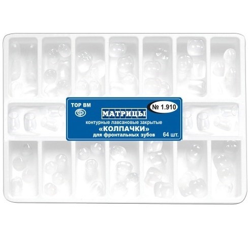 Описание: ТОР-1.910 набор матриц-колпачков для фронтальных зубов 64 шт.Матрицы № 1.910 контурные лавсановые закрытые "колпачки" для фронтальных зубов 64 шт.