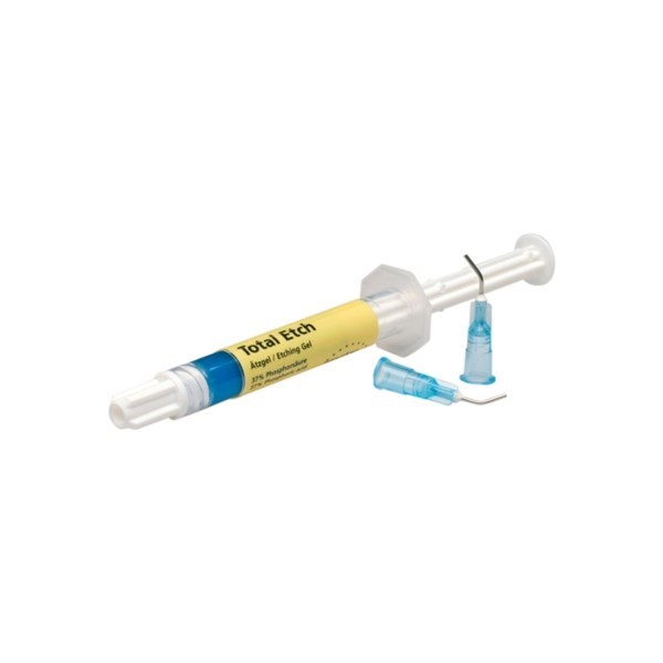 Total Etch – это гель для протравки 37%-ной фосфорной кислоты. Служит для протравки эмали и подготовки дентина в рамках запечатывания, терапии прямого пломбирования композитом, а также адгезивной фиксации реставраций, изготовленных лабораторным способом из цельной керамики или композитов.