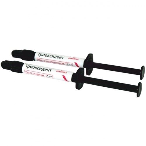 Материал «Триоксидент» паста/паста выпускается в виде комплекта: паста основная и паста каталитическая. Материал содержит оксиды кальция, кремния, алюминия, дисалицилатную смолу, рентгеноконтрастное вещество, наполнители и пластификатор.