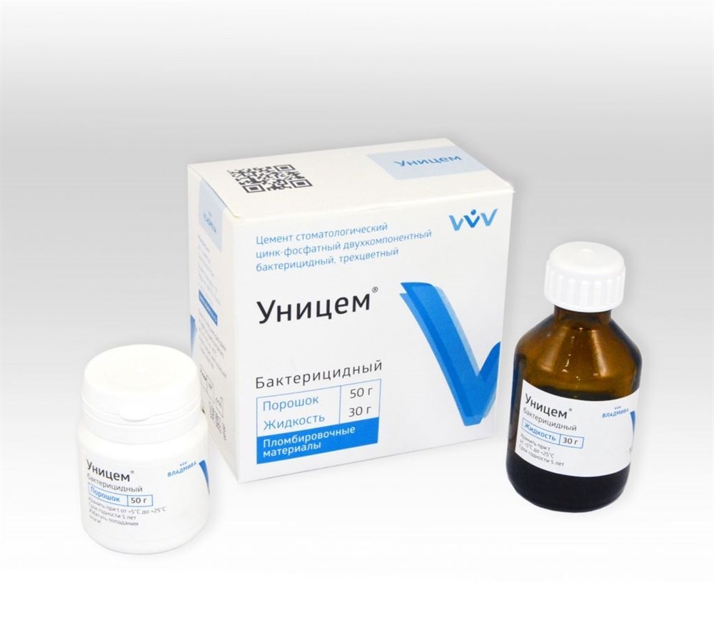 Универсальный усовершенствованный цинк-фосфатный цемент «Уницем», обладает высокими показателями механической прочности при сжатии (100 МПа) и химической устойчивости. Цемент образуется при затворении порошка, содержащего окись цинка с модифицирующими добавками, жидкостью, предсталяющей собой ортофосфорную кислоту сниженной активности. Толщина пленки цемента для фиксации не превышает 25 мкм.
