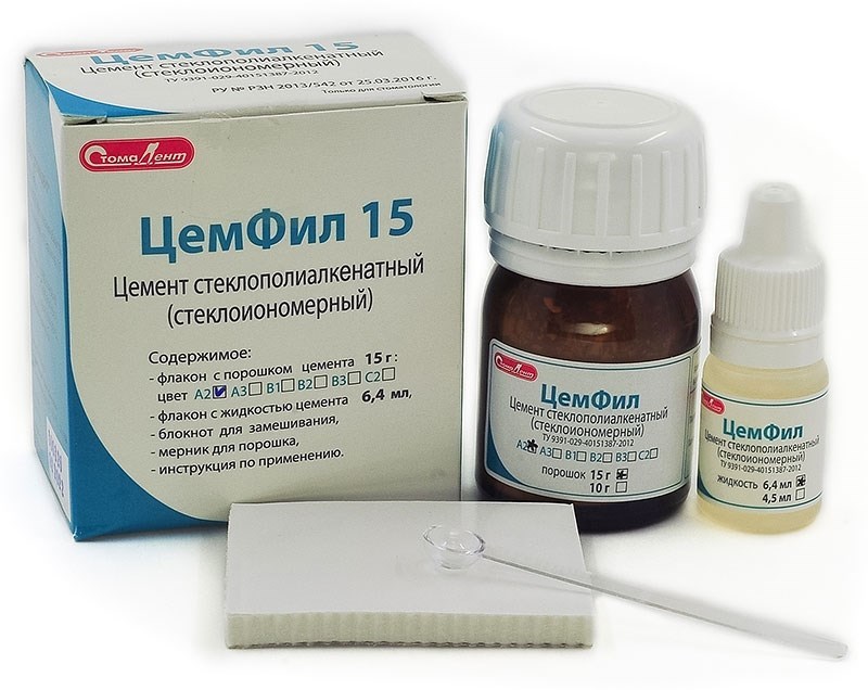 ЦЕМФИЛ 15 универсальный стеклополиалкенатный (стеклоиономерный) рентгеноконтрастный цемент для подкладок и реставрации. Порошок 15 г, жидкость 6,4 мл, стандартный цвет A3.