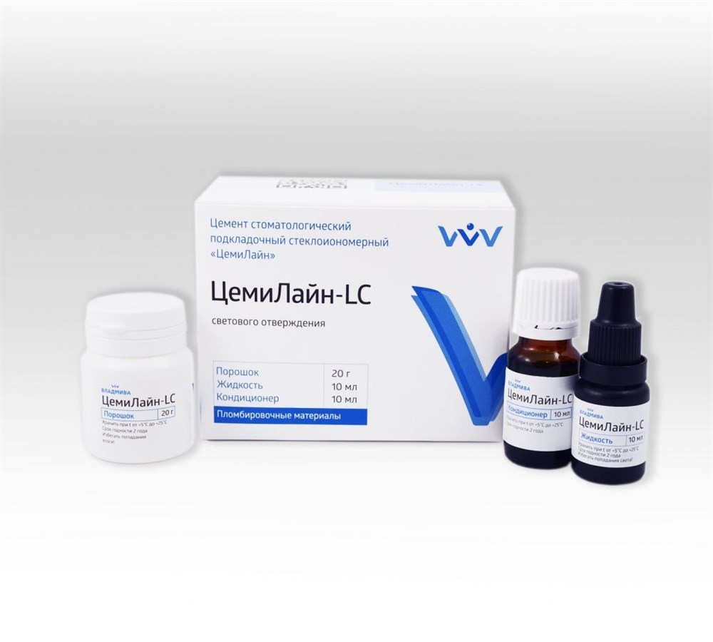 Стеклоиономерный цемент светового отверждения «Цемилайн-LC» выпускается в виде комплекта порошок-жидкость. Порошок представляет собой тонкоизмельченное алюмофторсиликатное стекло с повышенным содержанием фтора. Жидкость — композиция водного раствора полиакриловой кислоты и олигомеров, содержащая инициаторы световой полимеризации.