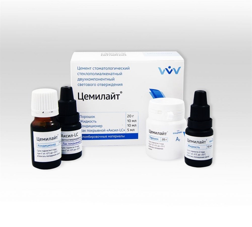 Стеклоиономерный цемент светового отверждения «Цемилайт» выпускается в виде комплекта порошок-жидкость, обладает высоким химическим сродством как к полимерным материалам, так и к тканям зуба, обеспечивает надежное краевое прилегание.
