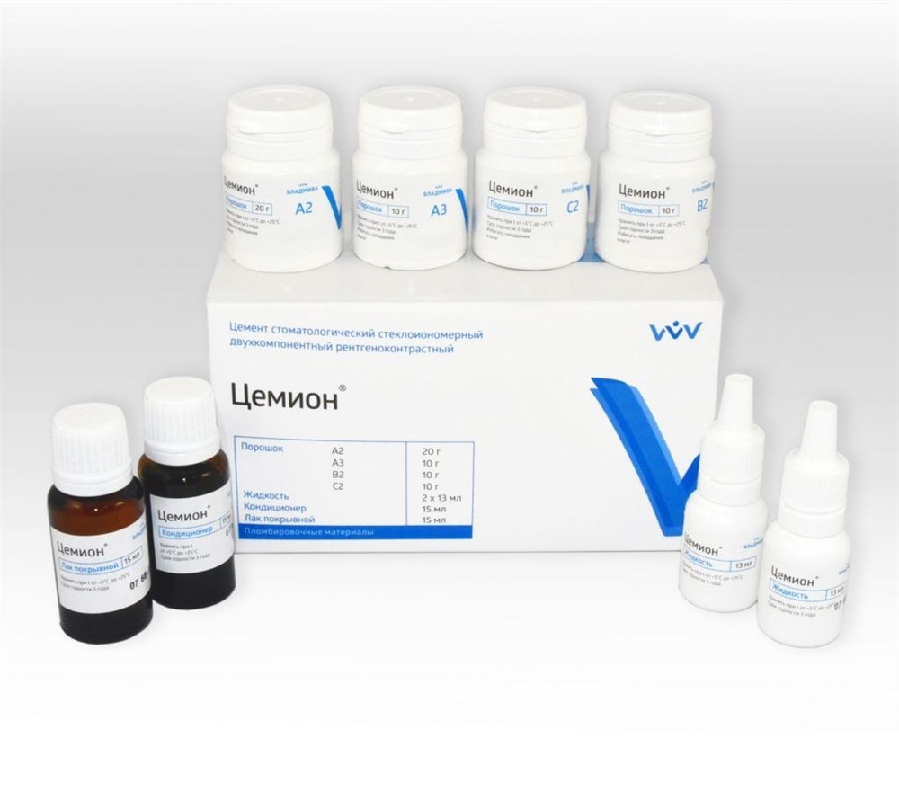 «Цемион» — традиционный стеклоиономерный цемент химического отверждения, обладающий химической адгезией к дентину и эмали. Выпускается в виде комплекта порошок-жидкость. «Цемион» образуется при смешивании порошка и жидкости. Порошок представляет собой измельченное алюмофторсиликатное стекло, жидкость – водный раствор модифицированной полиакриловой кислоты.