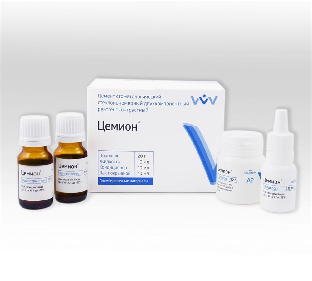 «Цемион» — традиционный стеклоиономерный цемент химического отверждения, обладающий химической адгезией к дентину и эмали. Выпускается в виде комплекта порошок-жидкость. «Цемион» образуется при смешивании порошка и жидкости. Порошок представляет собой измельченное алюмофторсиликатное стекло, жидкость – водный раствор модифицированной полиакриловой кислоты.
