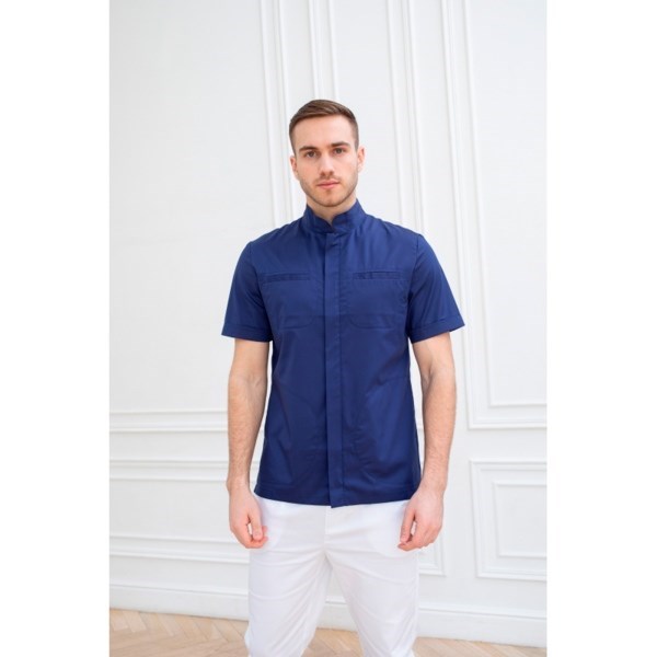 Медицинская мужская рубашка бренда Dr.Nice выполнена в современном крое с воротником-стойкой и с короткими рукавами. Модель с супатной застежкой на молнии и имеет два нагрудных кармана и два боковых.