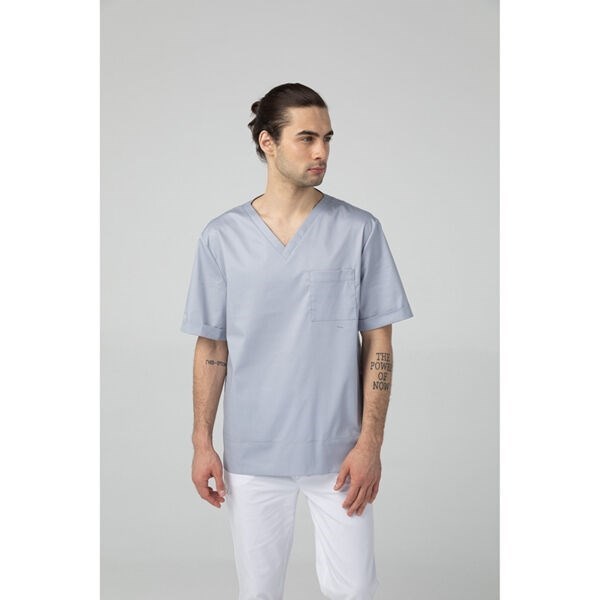 Медицинская мужская туника от бренда Dr.Nice выполнена в прямом фасоне с коротким рукавом и V-образным вырезом. Изделие дополняет один нагрудный карман и разрезы в боковых швах.