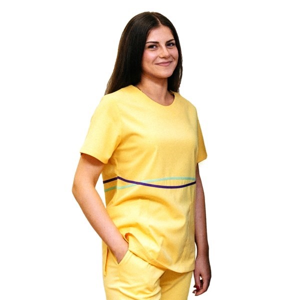 Женская медицинская туника серии 242 Florida от бренда PULSE имеет прямой крой, короткий рукав, разрезы по бокам и круглый вырез. Модель дополнена двумя накладными карманами, а также яркими контрастными полосками на передней полочке. Для удобства надевания на левом плечевом шве горловины имеется застежка на металлических кнопках. Данное изделие доступно в разных цветовых вариантах.