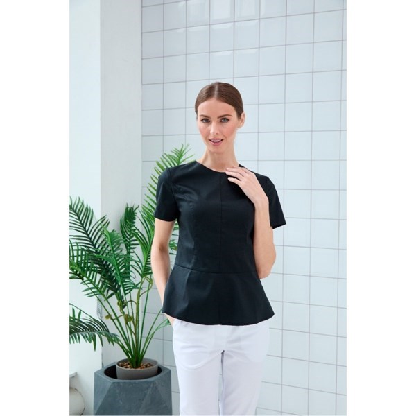 Женская туника с коротким рукавом выполнена в стильном дизайне. Крой отрезной по талии, снизу декорирована баской. Сзади имеется застежка-молния.