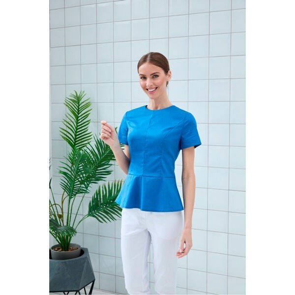 Женская туника с коротким рукавом выполнена в стильном дизайне. Крой отрезной по талии, снизу декорирована баской. Сзади имеется застежка-молния.