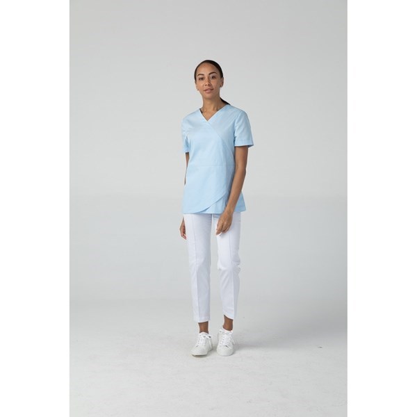 Женская медицинская туника с V-образным вырезом от бренда Dr.Nice выполнена в современном стиле с оригинальной дизайнерской отделкой с имитацией запаха по передней части изделия. Модель прямого кроя с коротким рукавом.