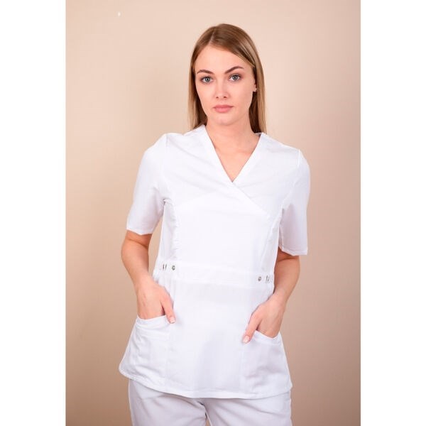 Женская медицинская блуза бренда Mariita имеет приталенный крой с V-образным вырезом, короткий рукав и два накладных кармана. Модель дополнена металлическими кнопками на планке по линии талии для регулирования объема.