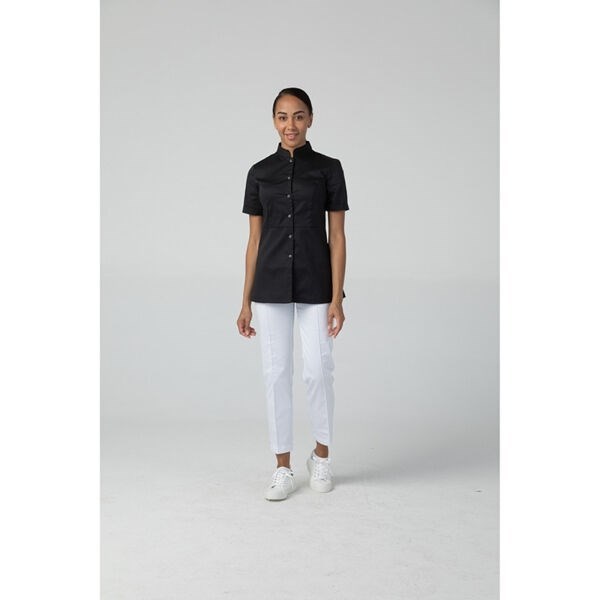 Медицинская туника отрезная по талии от бренда Dr.Nice имеет воротник-стойку, короткий рукав с отворотом и вытачки на груди для лучшего прилегания. Изделие застегивается на металлические кнопки спереди.