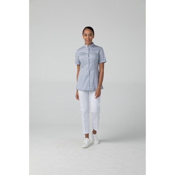 Медицинская туника отрезная по талии от бренда Dr.Nice имеет воротник-стойку, короткий рукав с отворотом и вытачки на груди для лучшего прилегания. Изделие застегивается на металлические кнопки спереди.