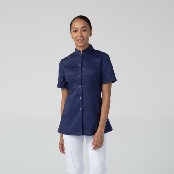 Медицинская туника отрезная по талии от бренда Dr.Nice имеет воротник-стойку, короткий рукав с отворотом и вытачки на груди для лучшего прилегания. Изделие застегивается на металлические кнопки спереди.