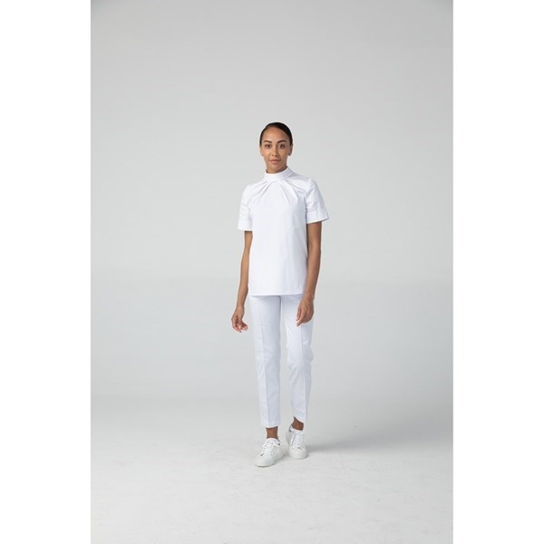 Медицинская женская туника бренда Dr.Nice выполнена с воротником-стойкой и с короткими рукавами. Модель застегивается сзади на кнопки.