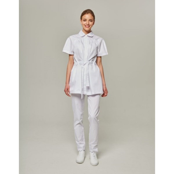 Медицинская куртка с коротким рукавом от бренда Dr.Nice имеет красивый округлый воротник и пояс-сборку на талии, что придает образу женственности. Модель дополнена карманами в боковых швах, сзади разрез-шлица.