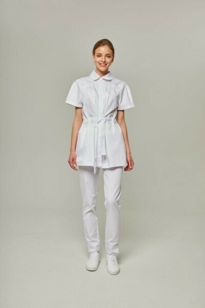 Медицинская куртка с коротким рукавом от бренда Dr.Nice имеет красивый округлый воротник и пояс-сборку на талии, что придает образу женственности. Модель дополнена карманами в боковых швах, сзади разрез-шлица.