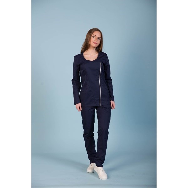 Медицинская женская туника от бренда Dr.Nice выполнена в оригинальном фасоне с косой застёжкой-молнией и округлым вырезом горловины. Изделие дополняет два накладных передних кармана и разрезы по бокам.