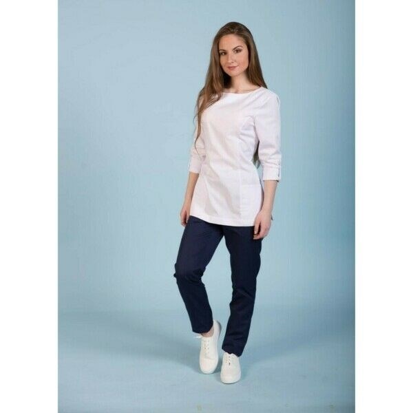 Медицинская женская туника бренда Dr.Nice имеет округлый воротник, застёжку-молнию сзади, два накладных кармана спереди и боковые разрезы для свободы движения. У изделия длинные рукава, длина которых регулируется отворотом с закреплением пуговицей сбоку.