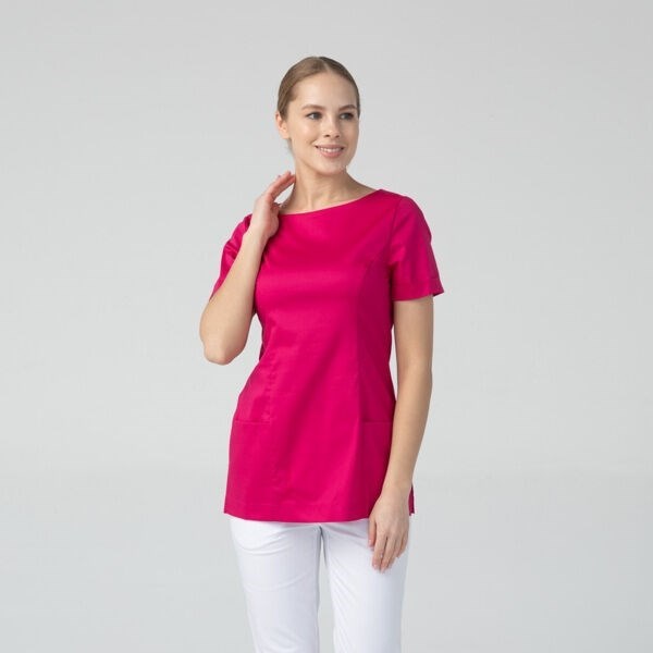 Медицинская женская туника бренда Dr.Nice с короткими рукавами имеет округлый воротник, застёжку-молнию сзади, два накладных кармана спереди и боковые разрезы для свободы движения.