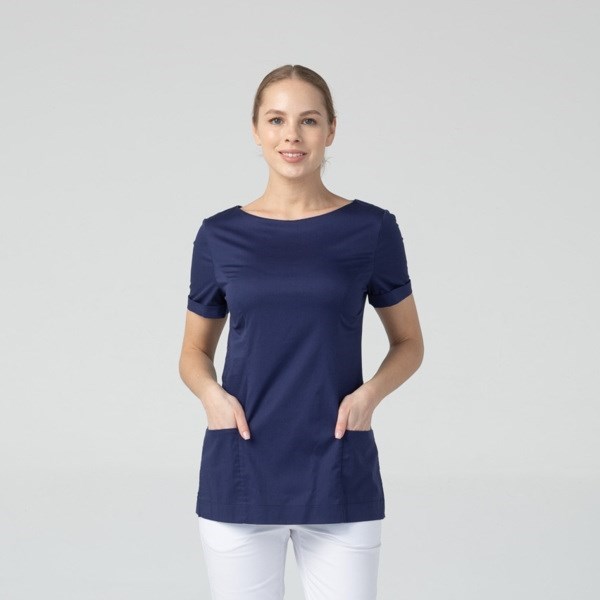 Медицинская женская туника бренда Dr.Nice с короткими рукавами имеет округлый воротник, застёжку-молнию сзади, два накладных кармана спереди и боковые разрезы для свободы движения.