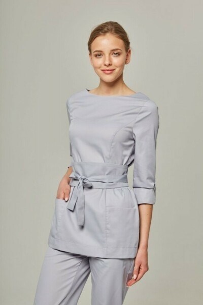 Медицинская туника женская с длинными рукавами от бренда Dr.Nice имеет округлый воротник, два накладных кармана спереди, разрезы по бокам и застёжку-молнию сзади. Длина рукава регулируется отворотом с закреплением пуговицей сбоку.