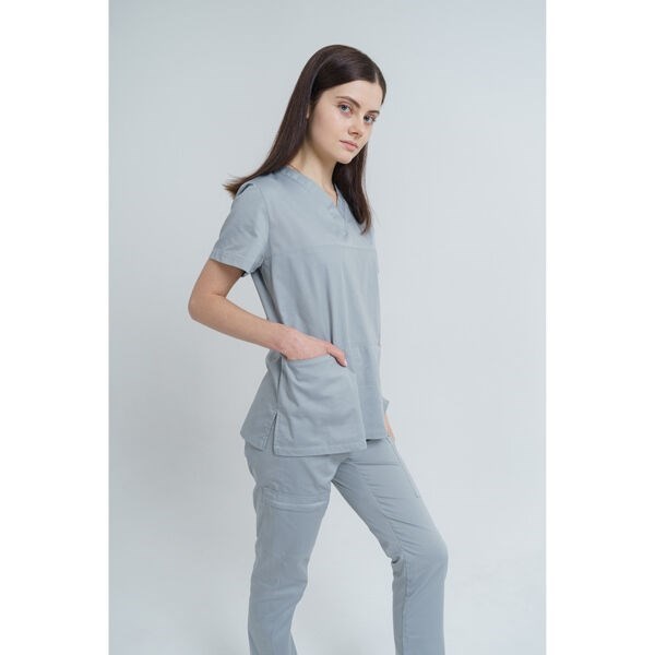 Женская медицинская туника TZ200 имеет прямой крой, короткий рукав, разрезы по бокам и V-образный вырез. Модель дополнена тремя прорезными карманами с цветной вставкой: два спереди и один на груди. Для удобства на левом плече имеется застежка на металлических кнопках.